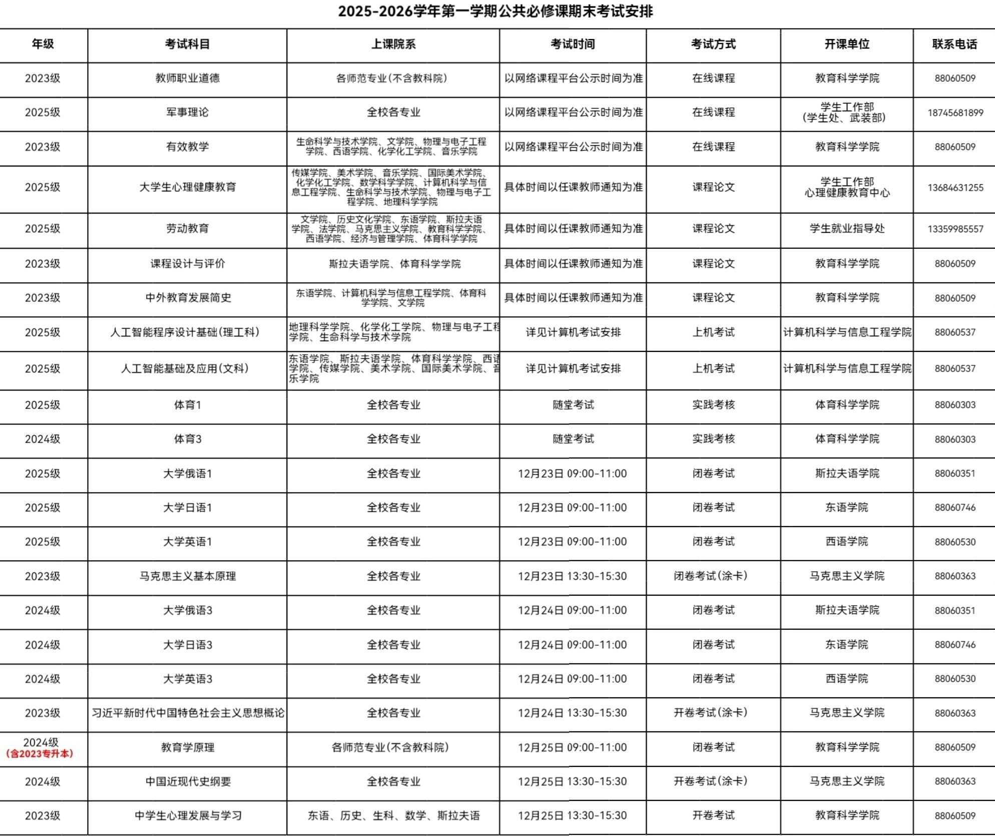 2025-2026学年第一学期公共必修课期末考试安排