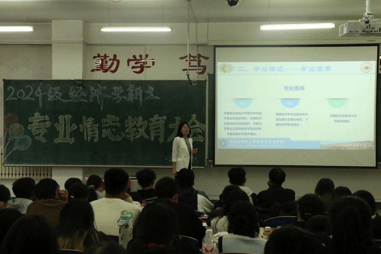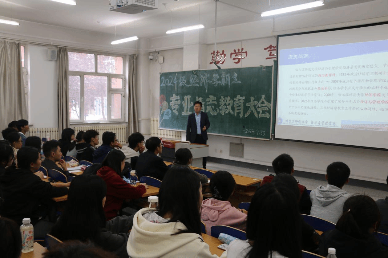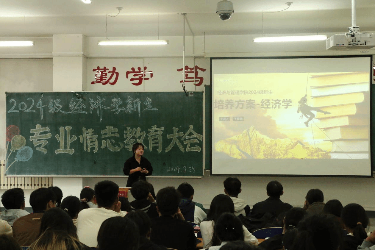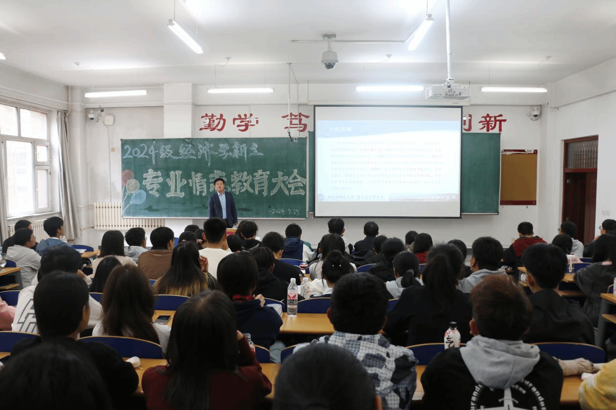 于9月25日13:00在崇师楼C01召开了2024级经济学专业新生情志教育大会。本次大会由经济系主任兼经济学专业负责人刘生老师、经济系副主任高荣伟老师、经济学教研室主任王雪微老师主讲,2024级经济学专业全体新生参加。