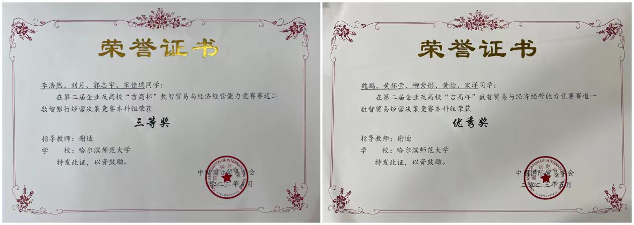 赛道一数智贸易经营决策竞赛由魏鹏、黄怀莹、柳紫彤、黄怡、宋洋组队,荣获全国优秀奖;赛道二数智银行经营决策竞赛由李浩然、刘月、郭志宇、宋佳瑞组队以总分607.25分位列东北赛区第二名、全国本科组第十三名,荣获全国三等奖。其中,2021级市场营销专业刘月负责的对私客户单项获得全国高校本科组第一的优异成绩。