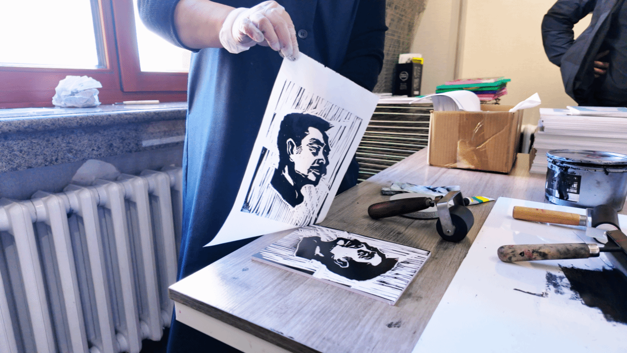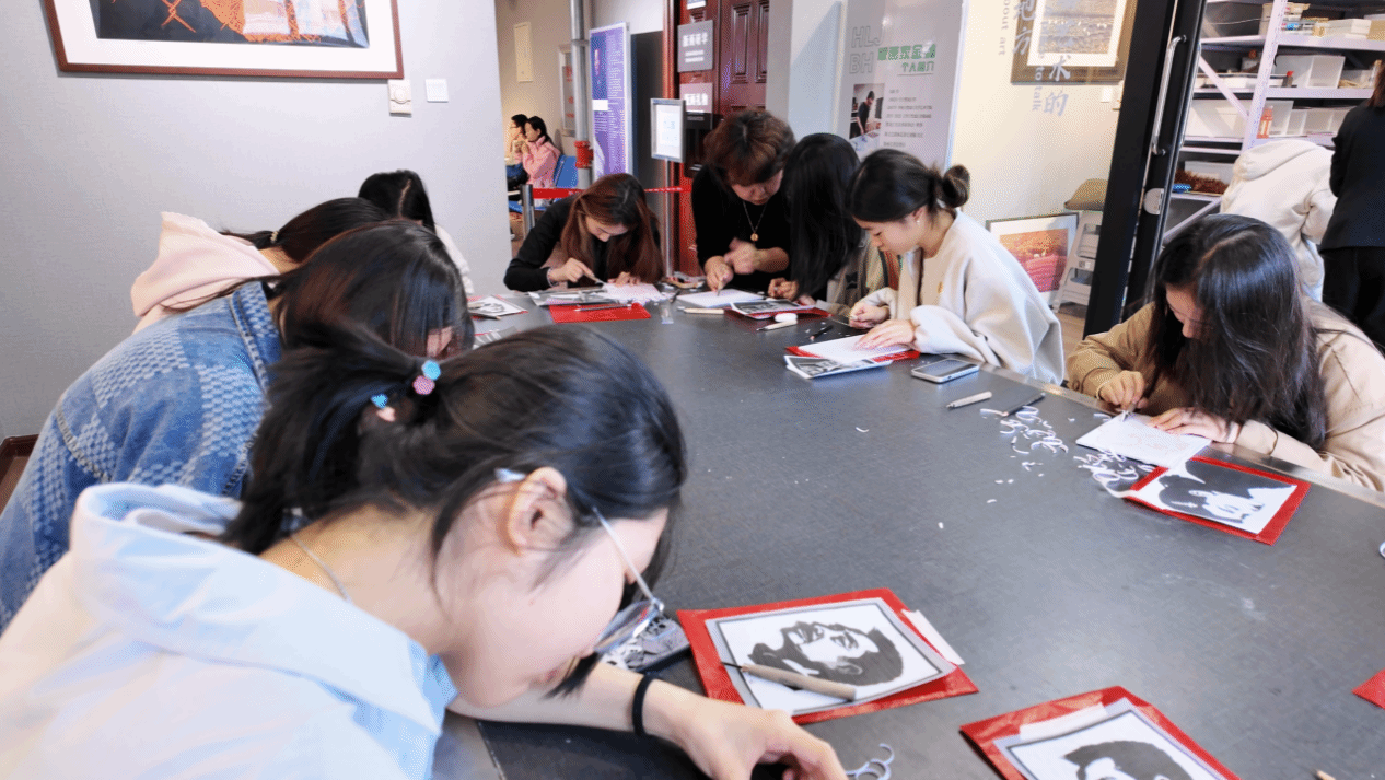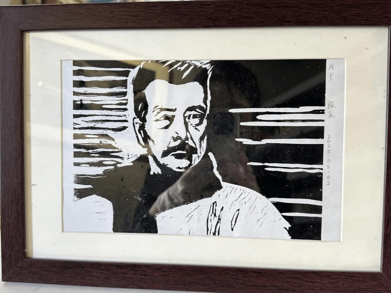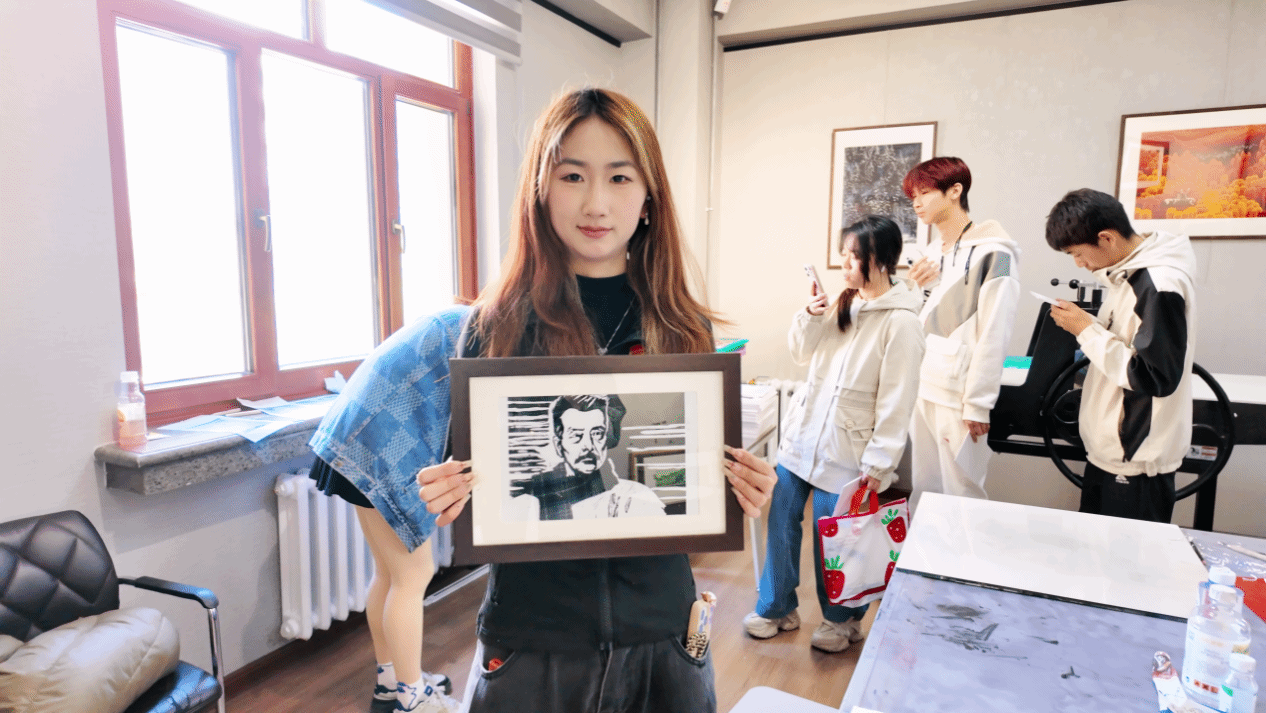 参观结束后,吴馆长带领师生们到体验教室制作版画作品,让大家更直观感受版画艺术,以沉浸式体验推动本土文化传承。同学们将鲁迅版画肖像等具有五四元素的模板创作,将照片的轮廓拓印在木板上,以刀为笔精心雕琢,每一刀专注而认真地投入创作都是与历史的对话,让大家切身体会到在传统技艺中触摸文化根脉。最后,吴洋馆长用滚筒蘸上油墨,均匀地涂抹在木板上,再轻轻覆盖上纸张,仔细地按压、揭起,一张张充满青年热情的版画作品就此呈现。
