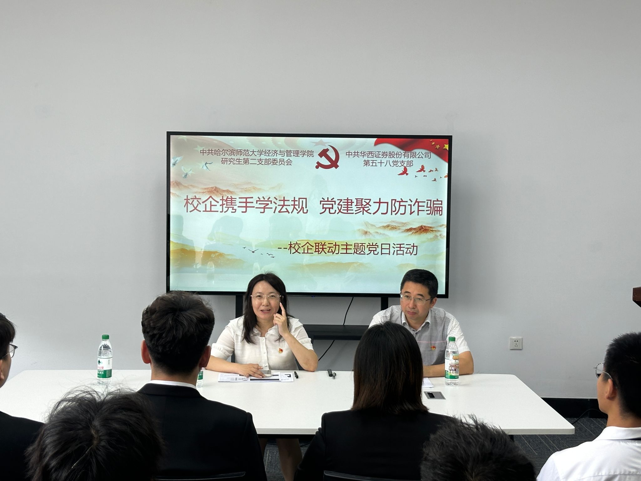 研究生第二党支部与华西证券哈尔滨第五十八党支部于2025年6月30日在崇师楼B区316教室联合举办“校企联手学法规,党建聚力防诈骗”主题党日活动。华西证券哈尔滨第五十八党支部书记邱波担任主讲,小说狂人