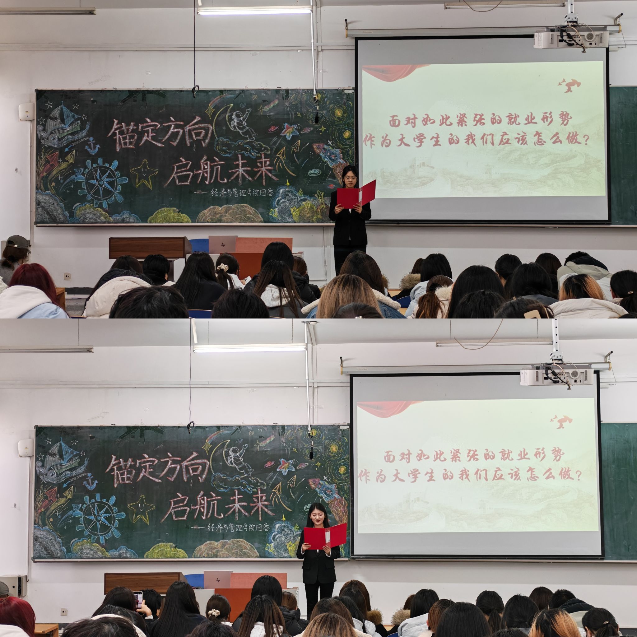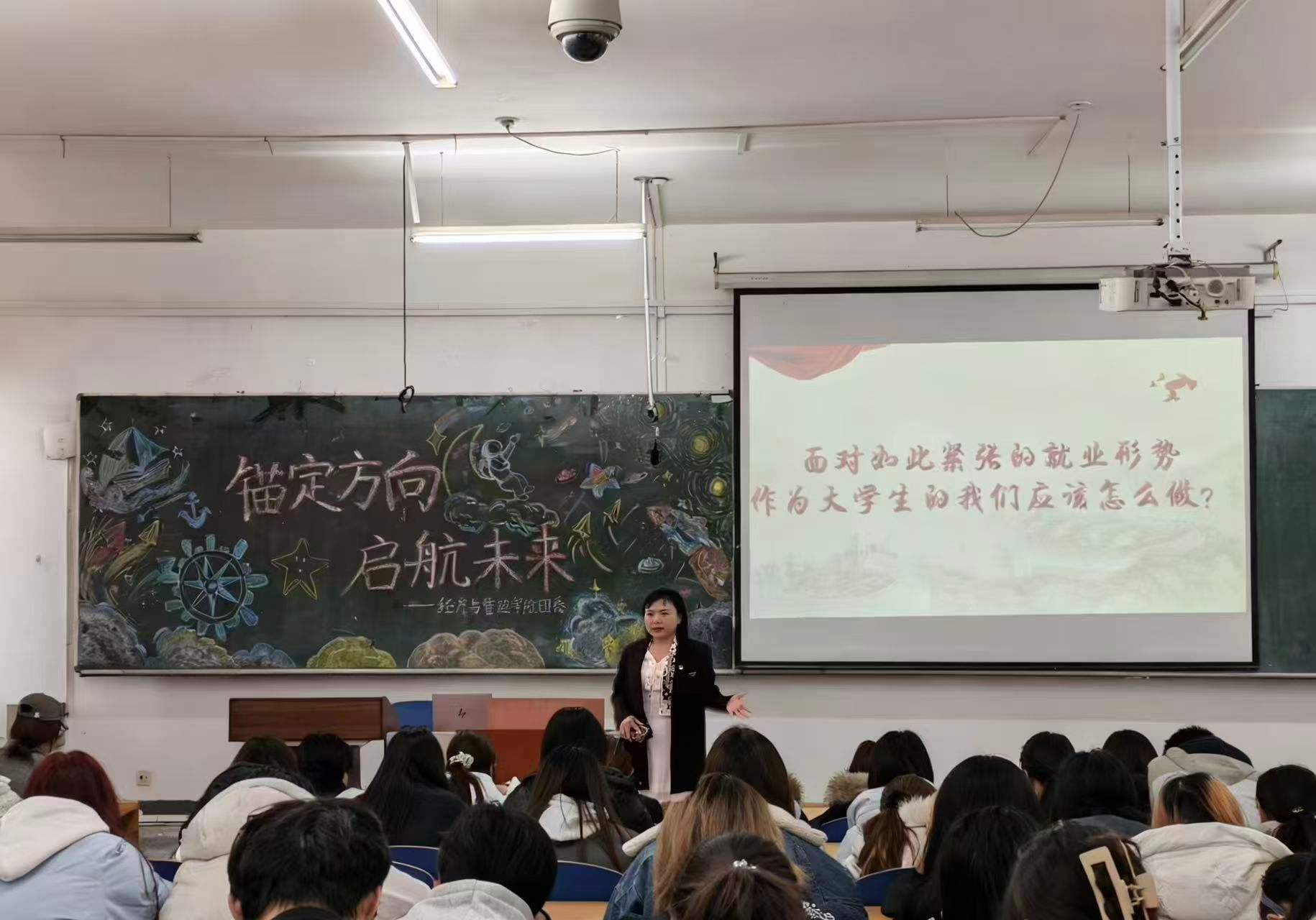 随后,主讲人围绕四大核心环节展开介绍。她通过聚焦数字经济等五大领域的新兴职业机遇和具体岗位要求,并结合相关报告数据,分析当前就业竞争的实际情况,帮助学生多维度了解职场。同时,她还分享了许多青年成长案例,引导学生跳出“只看个人发展”的单一思路,在规划职业时兼顾自身需求与社会需求,让未来的职业选择更贴合实际。