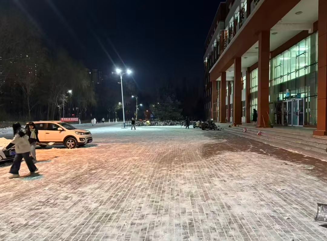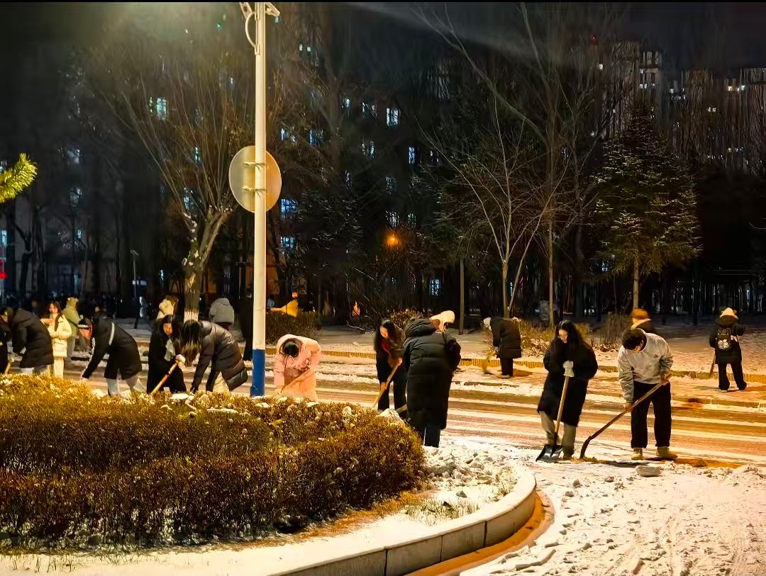 傍晚时分,参与扫雪的同学们准时集结,路边的路灯次第亮起,橘黄色的暖光漫过雪地,将细雪染成温柔的金屑。尽管夜色渐浓,同学们仍分工明确、默契配合:有的戴好手套弯腰清扫路面浮雪,动作麻利高效;有的攥紧工具挥锹铲除凝结的薄冰,力道十足;有的负责将积雪转运至指定区域,脚步匆匆不停。这场雪夜扫雪行动,是经管学子责任与担当的生动体现。雪夜虽寒,人心向暖,每一份付出,都让校园的冬日更添温度。