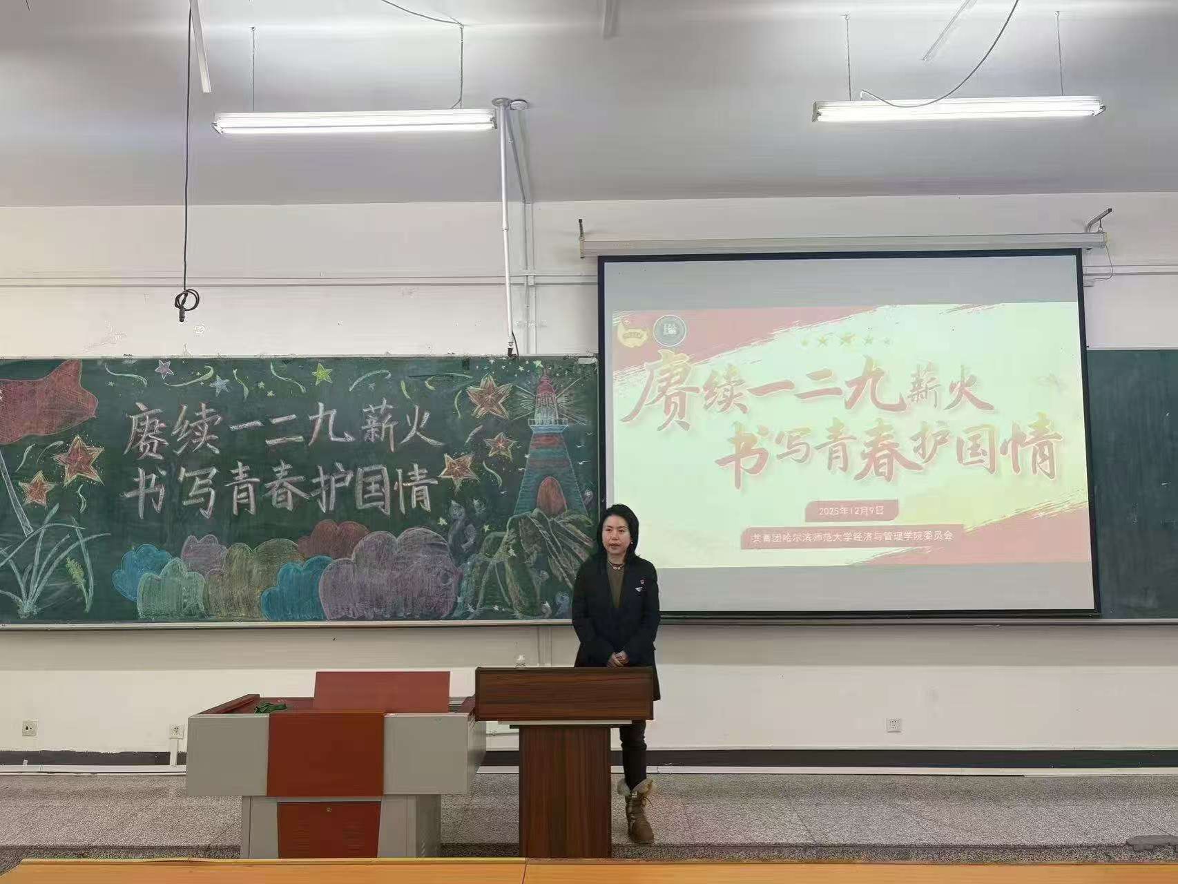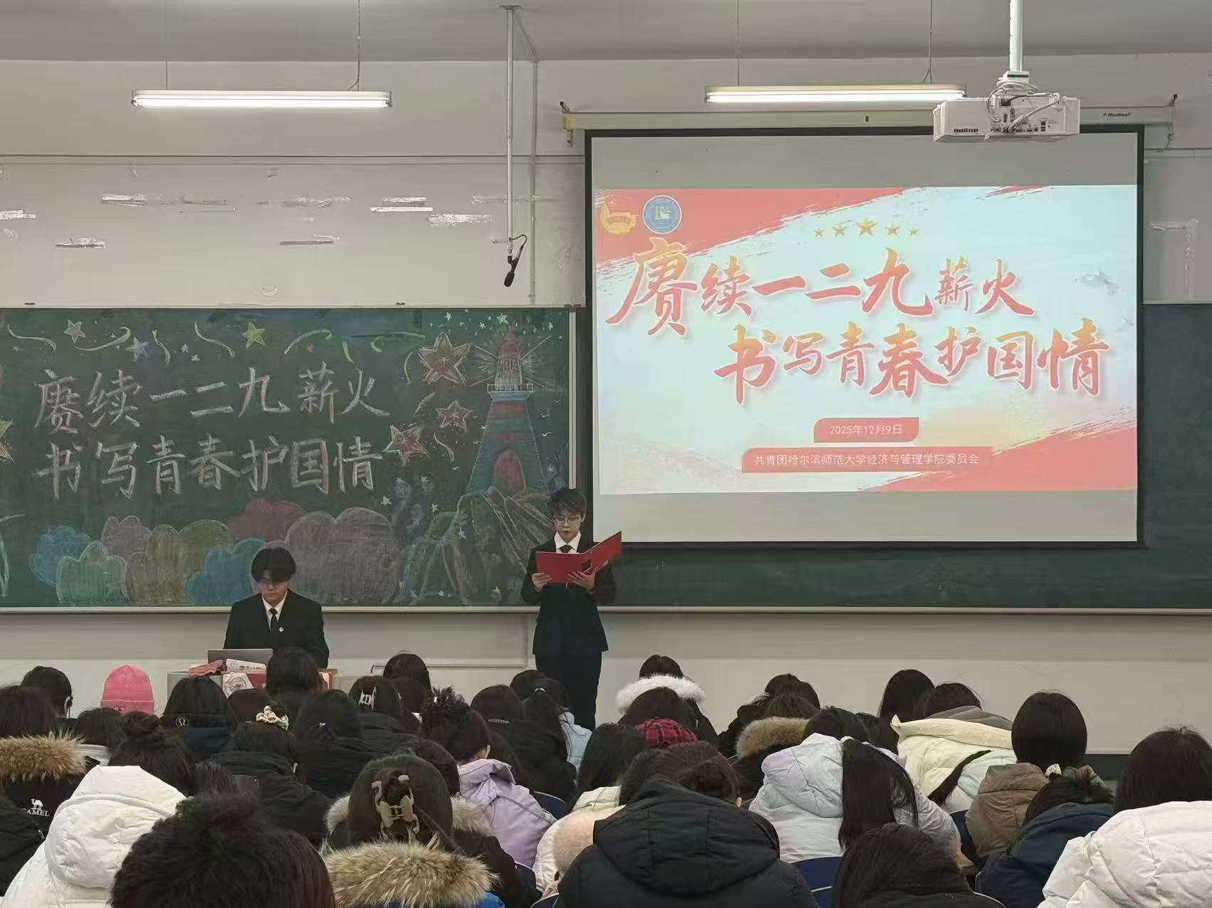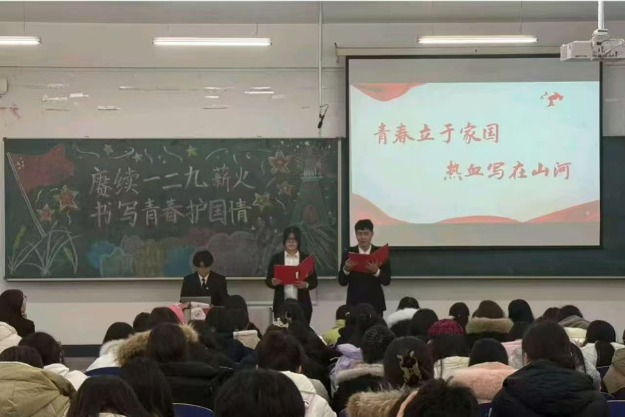 于2025年12月9日15:20在崇师楼D502开展“赓续一二·九薪火,书写青春护国情”主题团日活动,活动由院团委学生干部主持,学院团委书记陈凤,各年级学生代表共160名参加。