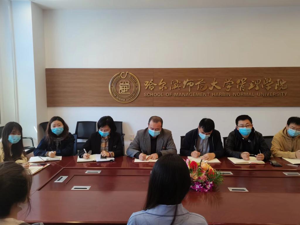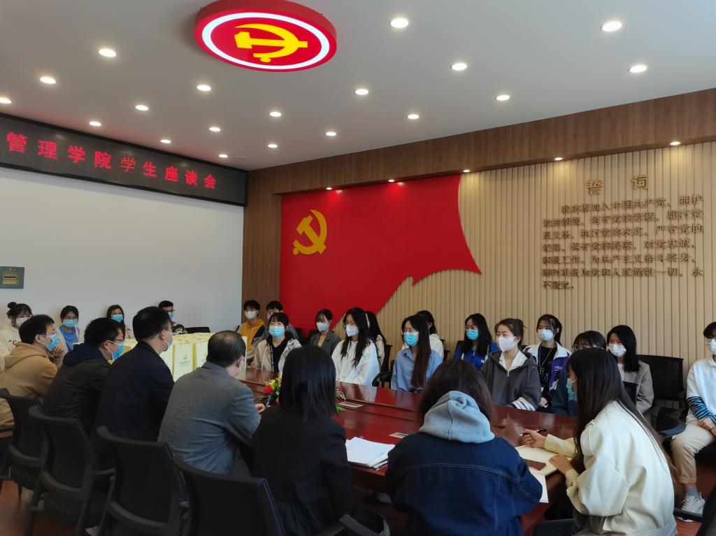 学生学习生活状态,切实“为学生办实事”,5月8日上午,管理学院举行“同心抗疫,共克难关”学生座谈会。管理学院党委书记邓铁男出席座谈会并讲话。副处级辅导员吕会庆、全体辅导员及学生代表参加座谈会。
