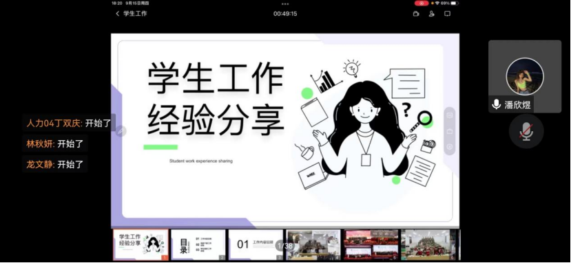 管理学院第十四届团委学生书记潘欣煜就学生工作部分向大家做了介绍。她向大家分享了自己曾任学生团委书记、素拓教官、朋辈辅导员等学生工作时的经历与经验。目标以提升热忱,毅力以磨平高山,潘欣煜深刻启发学弟学妹们,机会是留给有准备的人的,同学们应该争做学生干部,而身为学生干部,就更要勇于担当,牢记初心。
