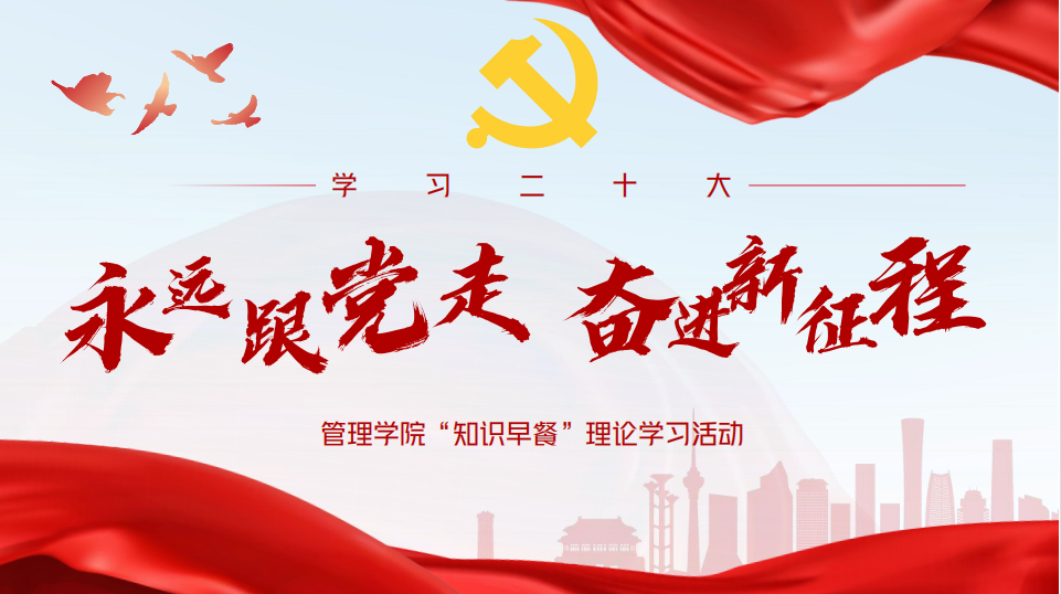 日月开新元,万象启新篇。2022年10月22日,中国共产党第二十次全国代表大会圆满完成各项议程和崇高使命,在北京胜利闭幕。为引导广大青年深刻领会党的二十大精神,提升青年学子学习党的二十大的积极性和自觉性,赓续红色血脉,厚植家国情怀,管理学院于10月24日在早自习期间,在各专业教室举办了“学习二十大,永远跟党走,奋进新征程”主题知识早餐理论学习活动,管理学院全体学生参与了此次活动。