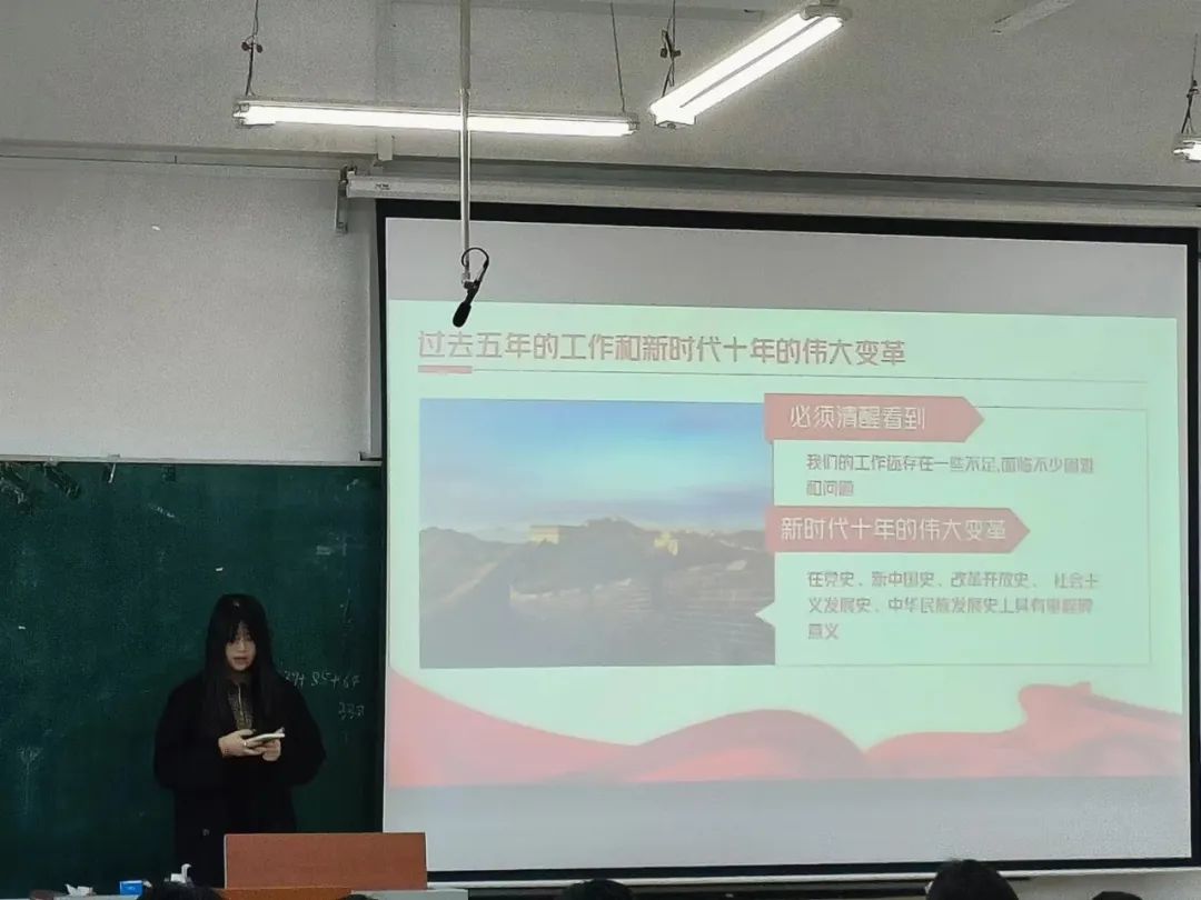 活动伊始,由各个专业主讲人根据学习内容进行了分享和讲解,简要回顾了中国共产党过去五年的工作,介绍了新时代十年的伟大变革,以及马克思主义中国化时代化的新成果。理论是实践的基础,实践是理论学习的再升华。他强调,作为青年学生,我们应在担当中历练,在实践中锤炼,怀着对党和国家的感恩之情,以顽强拼搏的精神,勤思敏行,砥砺前行,激扬青春梦,奋进新征程!