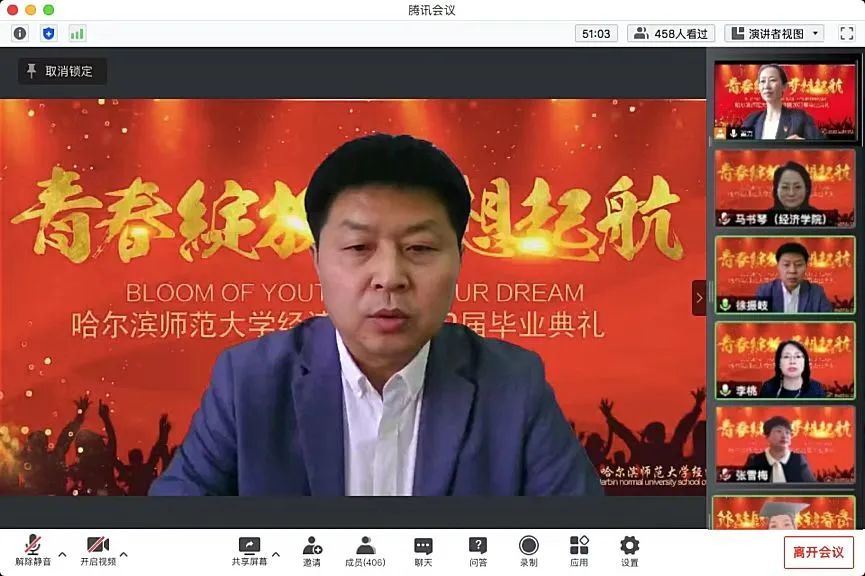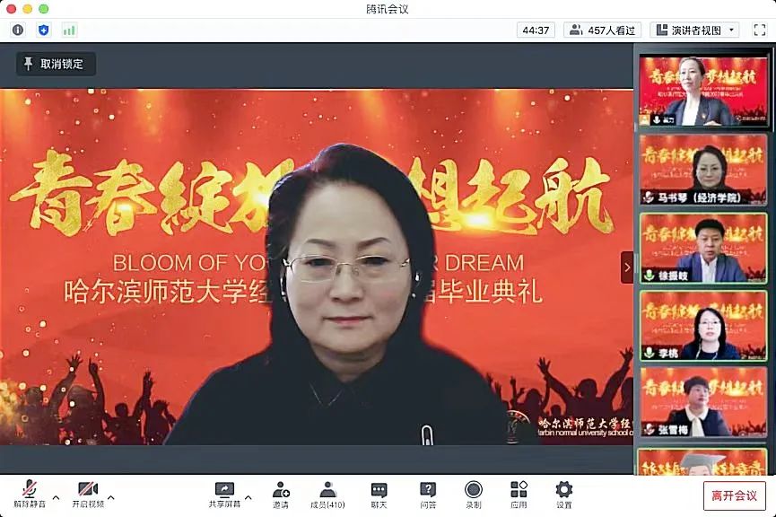 为扎实做好毕业生离校教育“十个一”活动,5月18日下午13:30,经济学院依托腾讯会议平台举行了2022届毕业生“云毕业典礼”。经济学院院长马书琴、党委书记徐振岐、副院长李桃,学院全体教职工和2022届毕业生参加此次典礼。毕业典礼由学院党委副书记翟力主持。