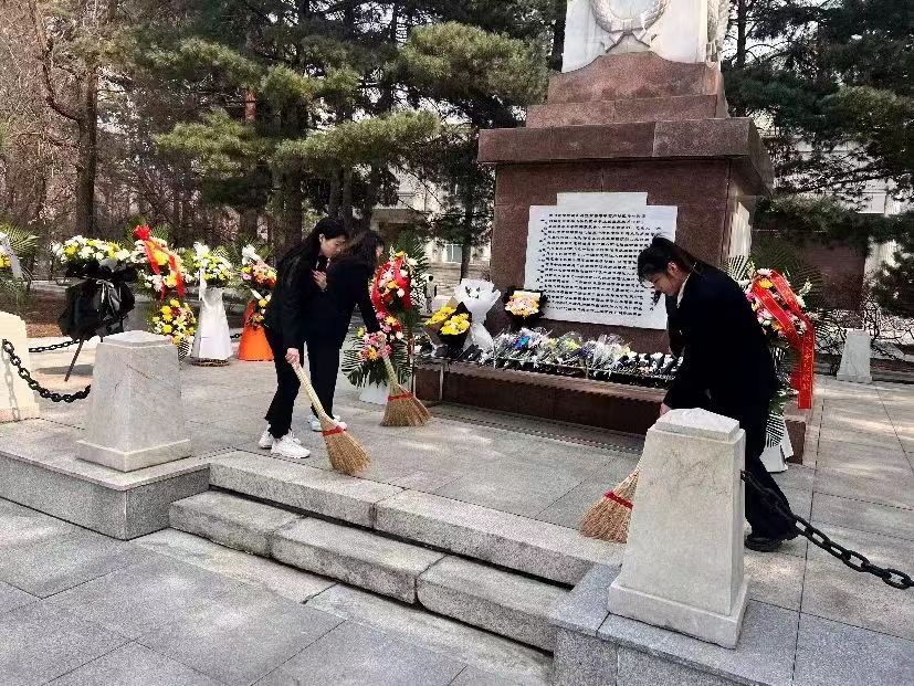 活动伊始,金东旭老师在朱瑞将军纪念碑前为大家讲述了东北民主联军和东北军区炮兵司令员朱瑞将军的英雄事迹,号召大家向英烈学习。面对着雄伟的烈士纪念碑,全体师生神情肃穆,向革命烈士默哀致意,打扫墓碑、敬献鲜花,表达对革命先辈的诚挚敬意与无限哀思。