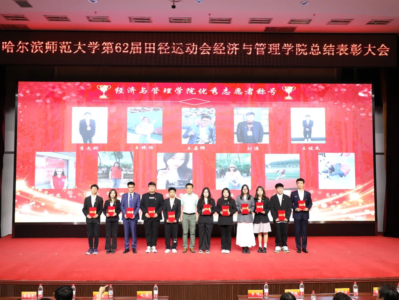 大会第四项,颁奖仪式。学院领导为获得突出贡献奖的老师、获得优秀运动员、体育积极分子及优秀志愿者的学生颁奖。