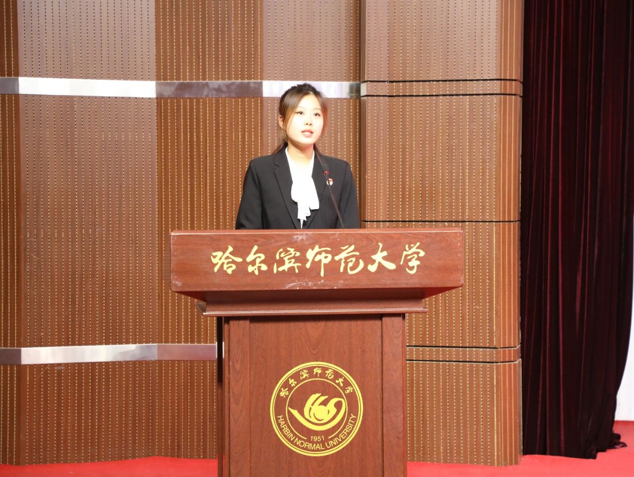 工作人员代表彭江南发言,彭江南同学表达了对此次运动会的心得体会,她说正是因为有这样一批默默无闻、辛勤劳动的人,才为这场运动会提供了坚实的保障。无论是志愿者服务人员,还是普通的工作人员,都默默地承担着自己的职责,为整个运动会保驾护航。所有的工作人员用自己的实际行动诠释了“奉献、友爱、互助、进步”的优良传统。最后,她对所有师生表达了感谢,并表示自己会在未来的工作中更加努力,为大家提供更好的服务。