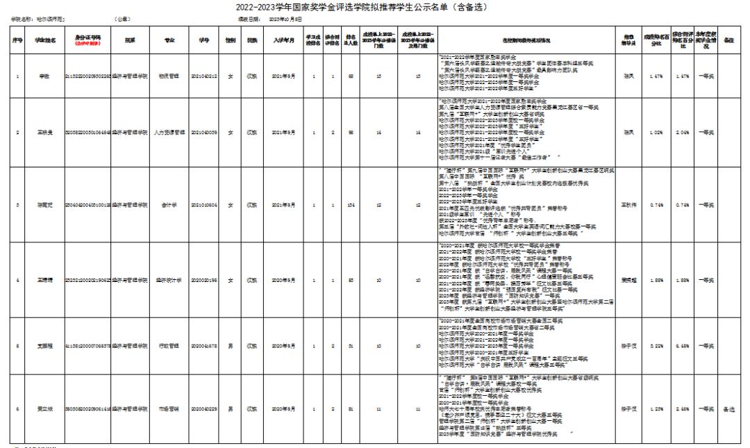 共有15名学生申报。其中2020级9人,2021级6人。学院对申请国家奖学金学生的资格和材料严格审核,对符合申报资格的学生组织学院联评,严格遵循评审范围和评审条件,坚持公开、公平、公正、择优的原则,根据15名同学的学习成绩排名、获奖评优、日常表现情况等进行考评,领导小组对本次评选逐一审核、讨论、评议,最后投票。根据投票结果决定推荐2021级物流管理专业李傲、2021级人力资源管理专业王轶曼、2021级会计学专业陈麓妃、2020级经济统计学专业王晴晴、2020级行政管理专业支鹏程、2020级市场营销专业黄立斌(备选)为小说狂人