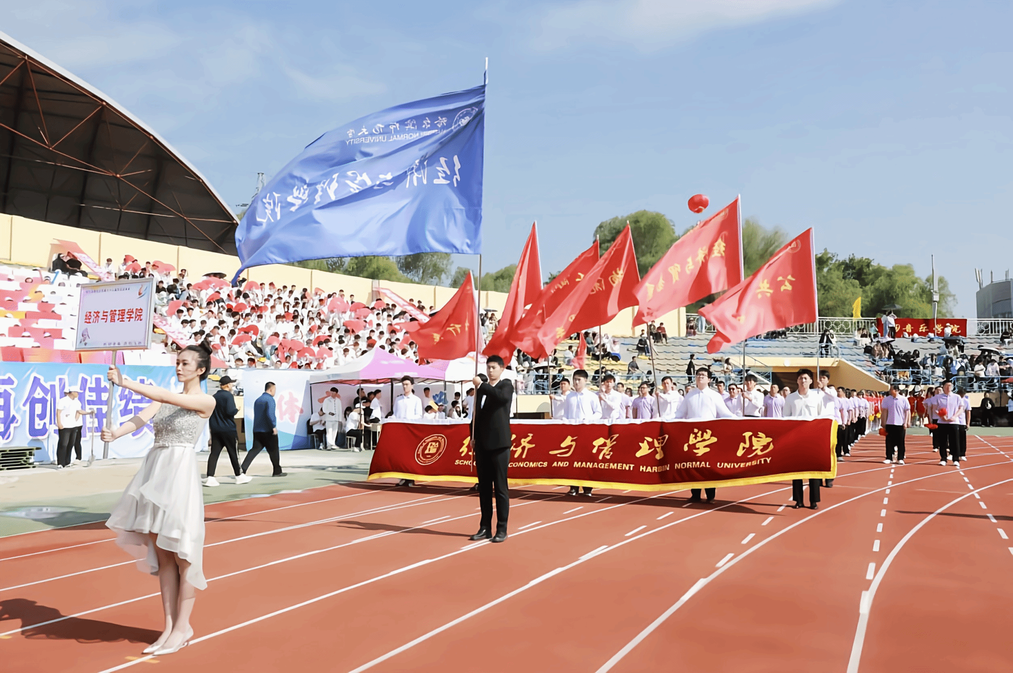 检阅队伍气势磅礴,学子们在老师们的带领下整齐划一走向主席台。他们步履铿锵,迈出奋进的步伐,神采奕奕,尽显经管风貌。每一次挥动旗帜,都传递着学院的精神与力量,以独特的方式书写着运动会的诗行,不仅增添了运动会的仪式感,更为这场青春的盛会增添了诗意与韵味。