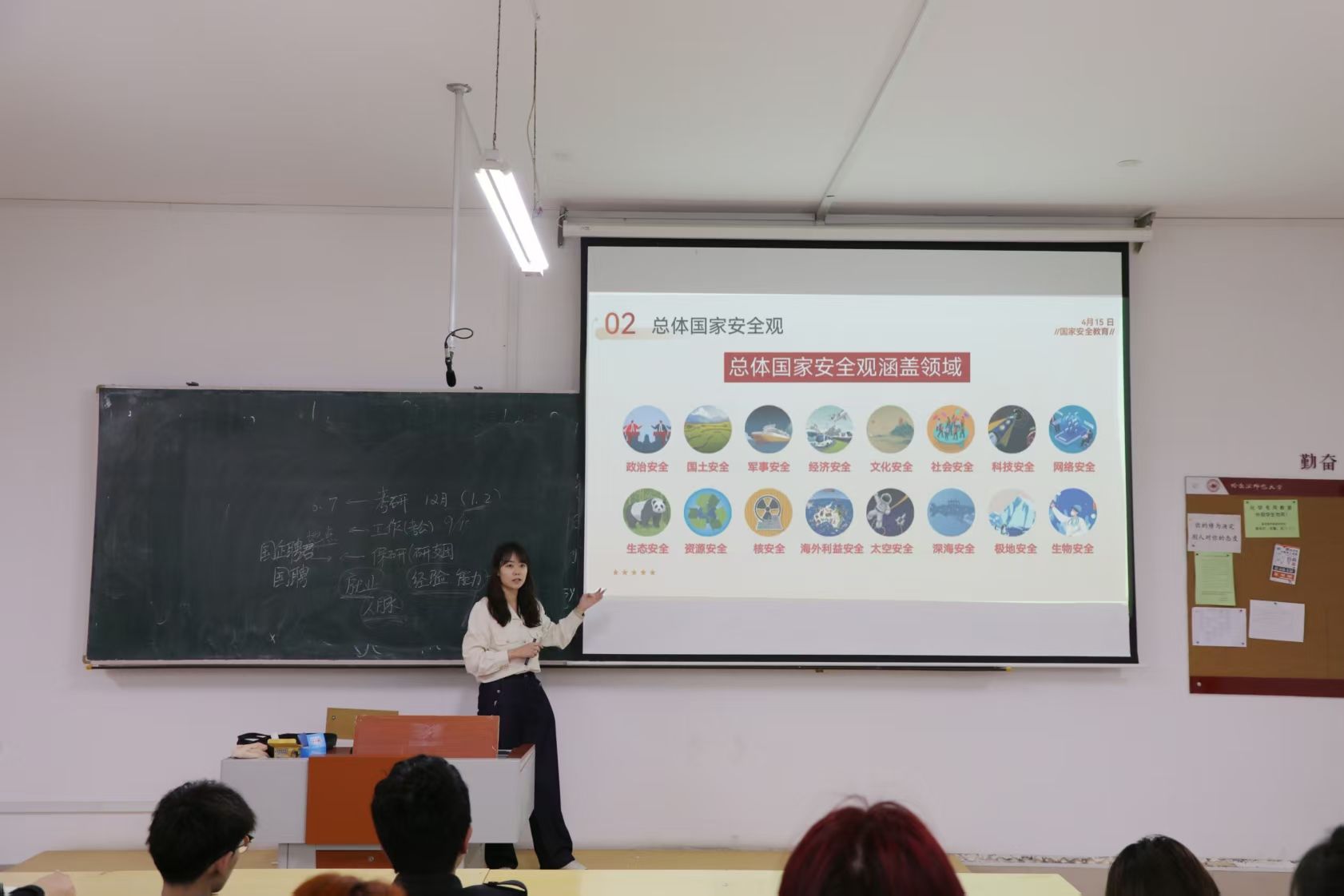 团委、国安青铸辅导员工作室联合开展“铸牢国安防线,共绘青春蓝图”国家安全教育“七进”活动。4月11日,在理工二号楼137教室,学校就业指导处兼职教师、学院团委副书记龚泳霖老师将国家安全教育知识带入了2024级化学化工学院劳动教育与职业发展课堂中。