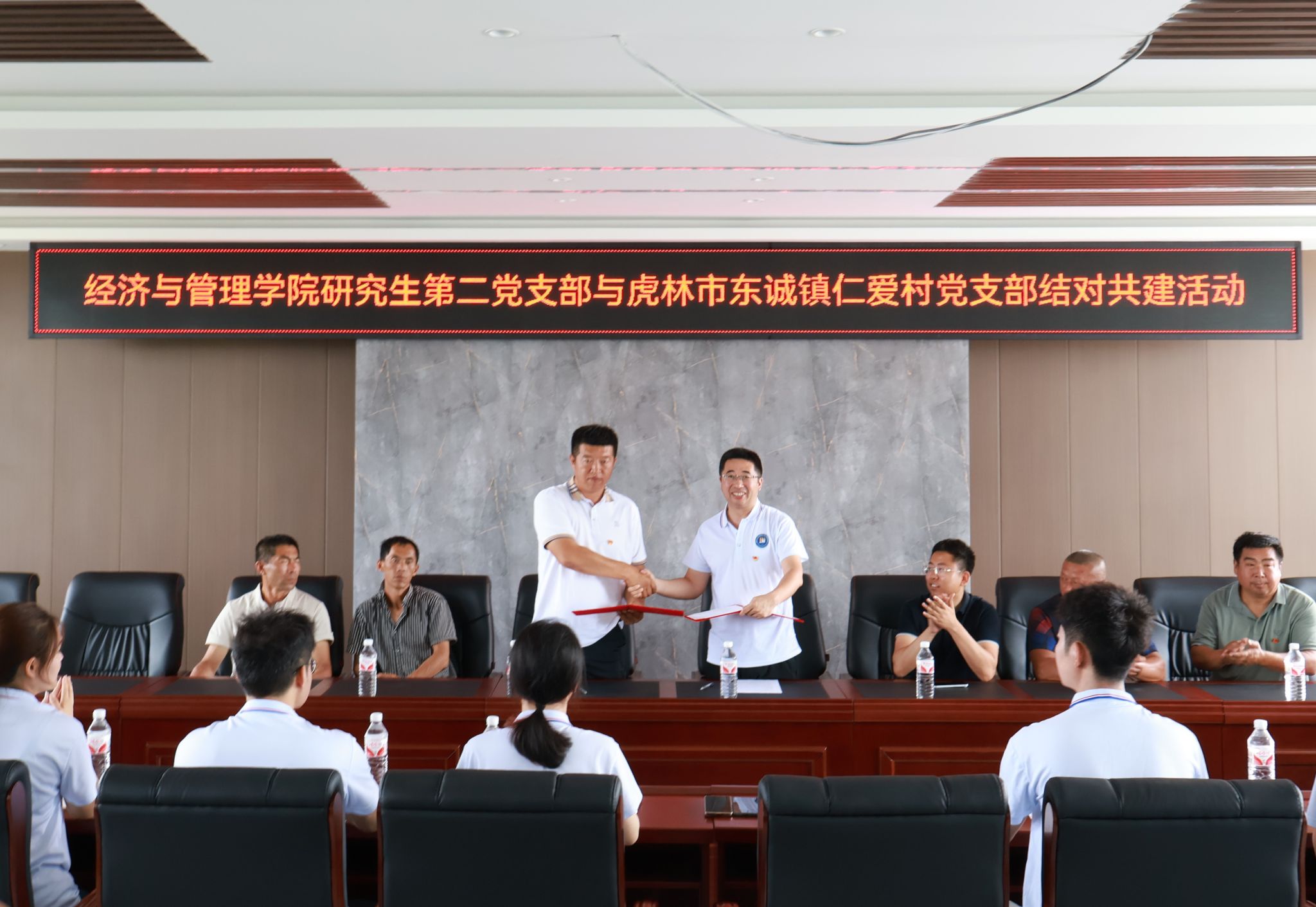 在双方党员共同见证下,赵东威老师与毕青松书记共同签署了党支部共建协议书并交接了横幅。协议明确双方将以“资源共享、优势互补、协同育人”为原则,在红色教育、乡村调研、产业帮扶等方面开展长效合作,推动“高校智慧反哺基层、基层实践育人增效”的良性循环。