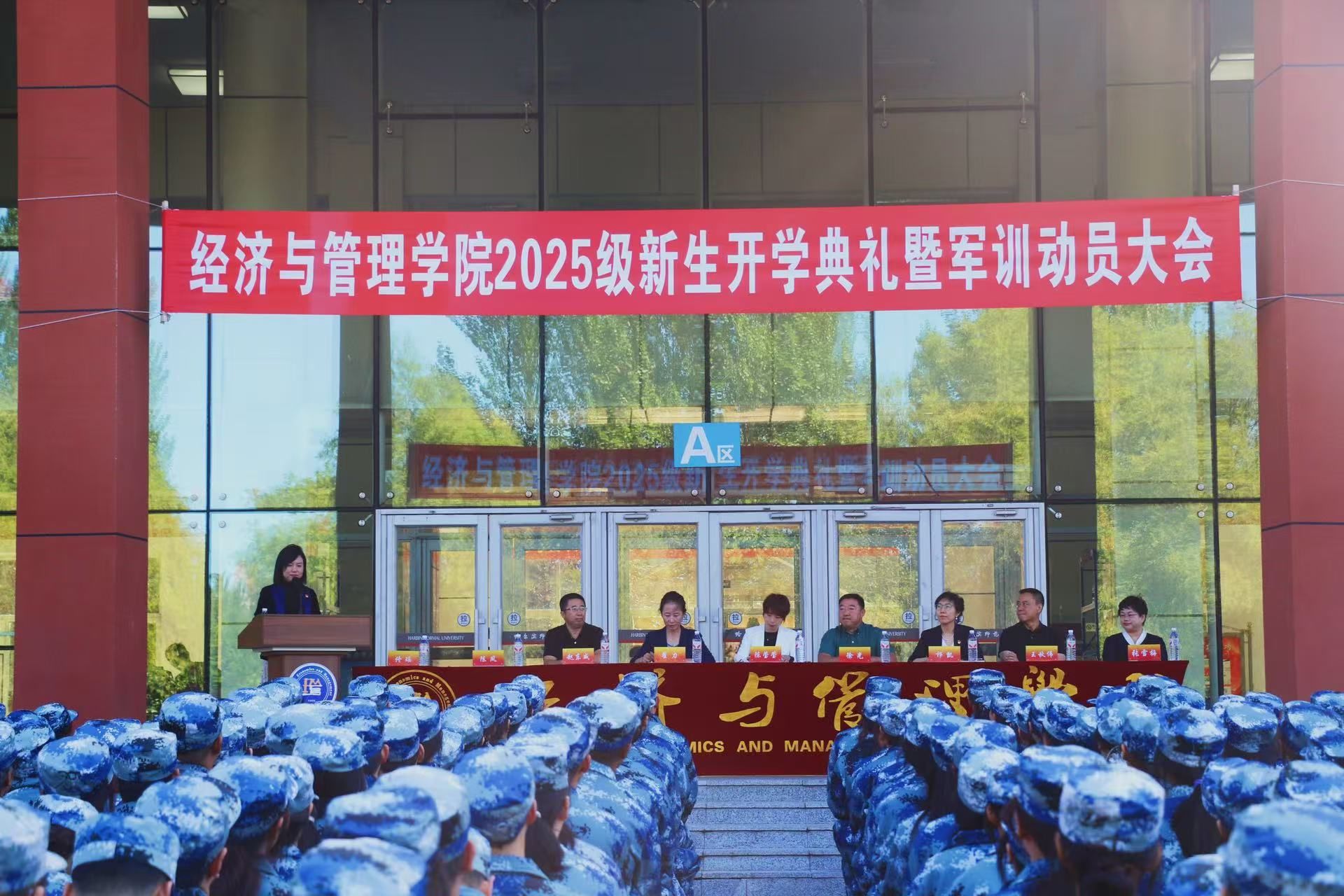 江北校区崇师楼A区召开2025级新生开学典礼暨军训动员大会。学院党委书记陈莹莹、院长徐光、党委副书记翟力、副院长祁凯、会计系主任张雪梅、研究生新生辅导员赵东威、本科生新生辅导员王秋伟、陈凤、佟瑶以及884名本硕新生参加本次大会。大会由新生辅导员陈凤主持。