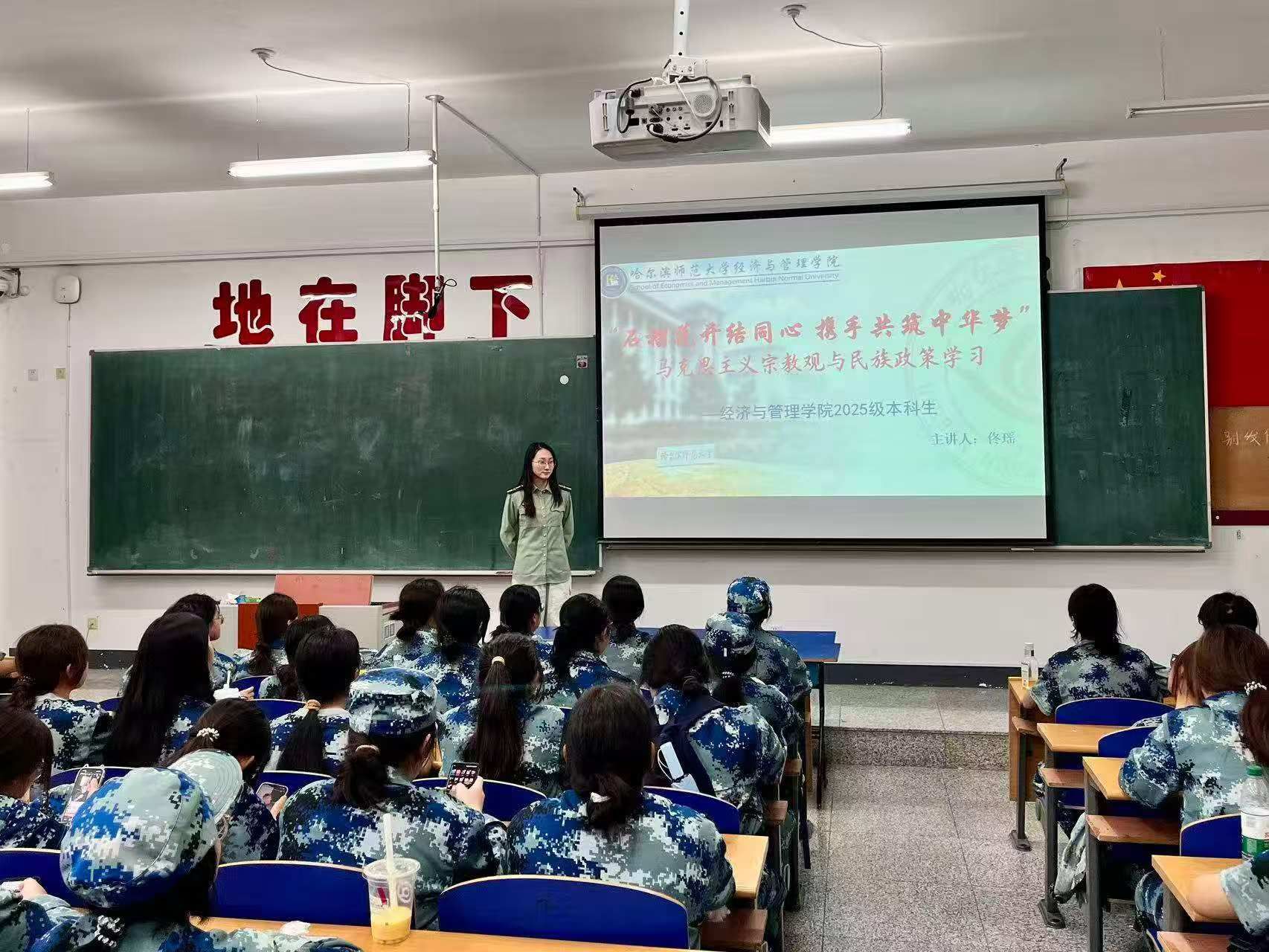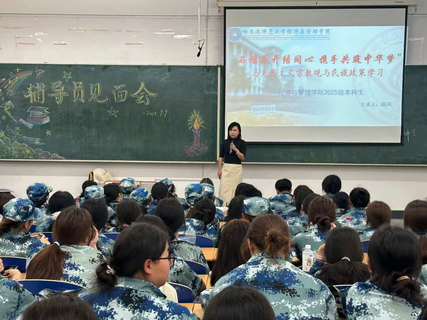 新生辅导员王秋伟老师、陈凤老师、佟瑶老师分别在崇师楼D502、D203、D202教室,面向全体2025级新生同步开展“宗教与民族认同”主题教育大会。