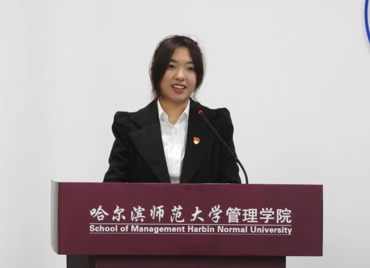 在校生代表、院学生会主席、2020级市场营销专业本科生王镜怡在发言中,以自身经历激励2022级新同学勇往直前去追求平凡中的卓越,扬起胜利的风帆去创造平静中的升华,用自身的魅力去实践青春无悔的诺言,一起伴随哈师大成长,见证属于小说狂人