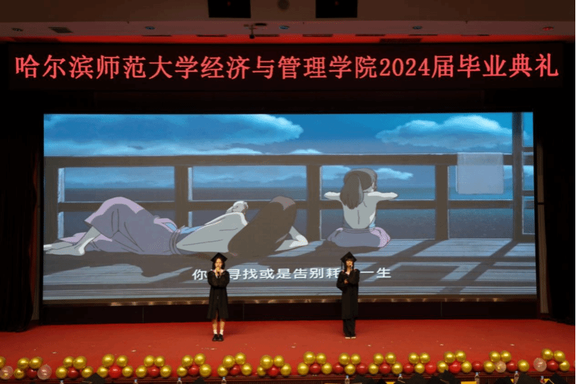 随着拨流苏仪式的结束,大屏幕上播放视频《师大南路的日子》为同学们回顾过去的时光,留下珍贵的回忆,照亮未来的道路,毕业生们面带微笑,眼中闪烁着对未来的憧憬和期待。