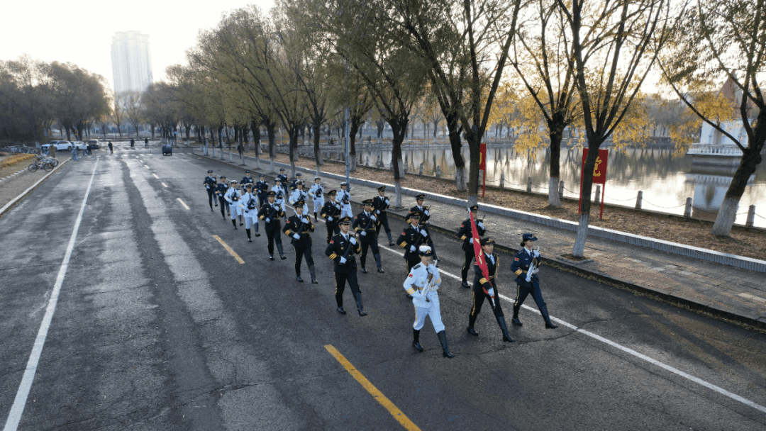 国旗护卫队出旗。早晨七时整,英姿飒爽的国旗护卫队队员们迈着整齐而有力的步伐出旗,他们身姿挺拔如松,鲜艳的五星红旗在他们肩头闪耀,如同一团燃烧的火焰,向着升旗台进发。