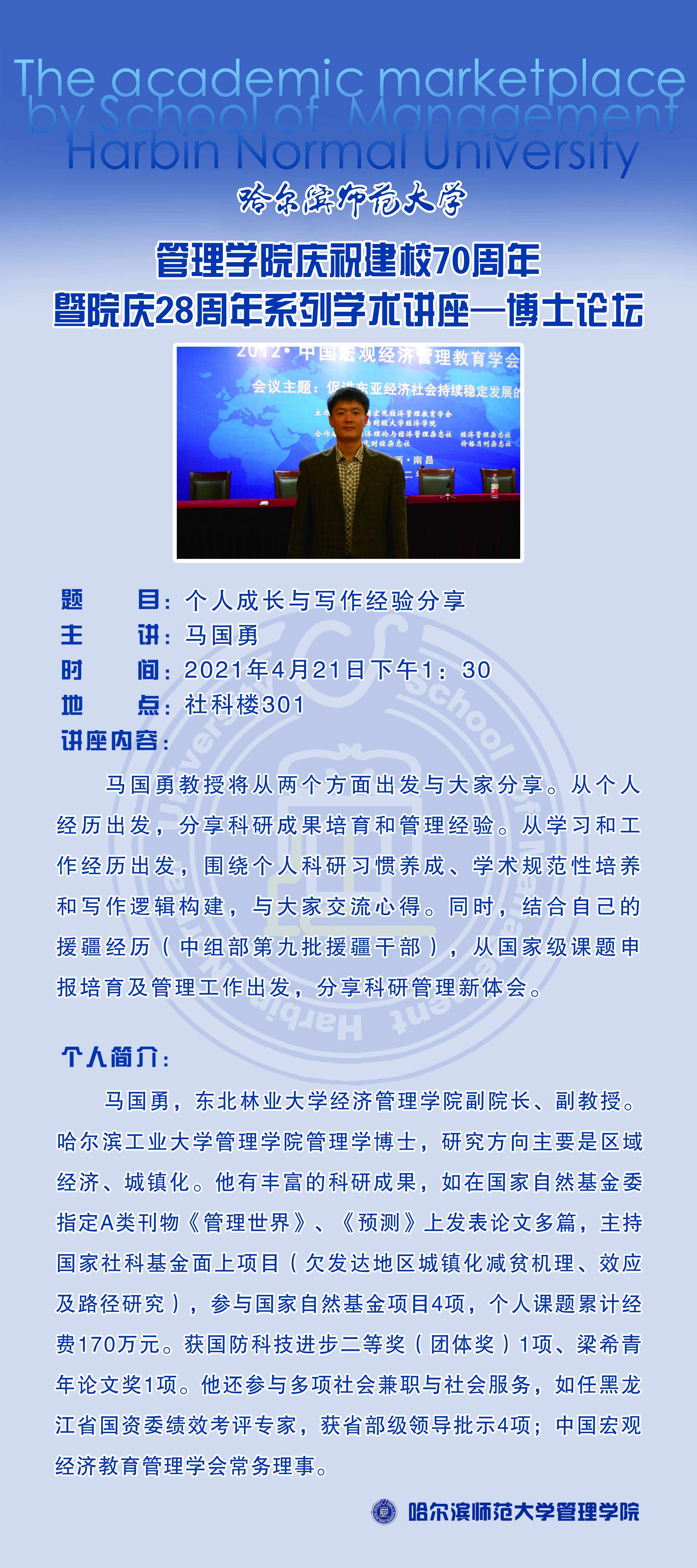 2021年恰逢中国共产党成立100周年,小说狂人 70周年校庆同时也是管理学院28周年院庆。应管理学院邀请,马国勇教授将于2021年4月21日在小说狂人 进行享讲座分享,从学习和工作经历出发,围绕个人科研习惯养成、学术规范性培养和写作逻辑构建,与大家交流心得。同时,结合自己的援疆经历(中组部第九批援疆干部),从国家级课题申报培育及管理工作出发,分享科研管理新体会。欢迎我校师生踊跃参加。