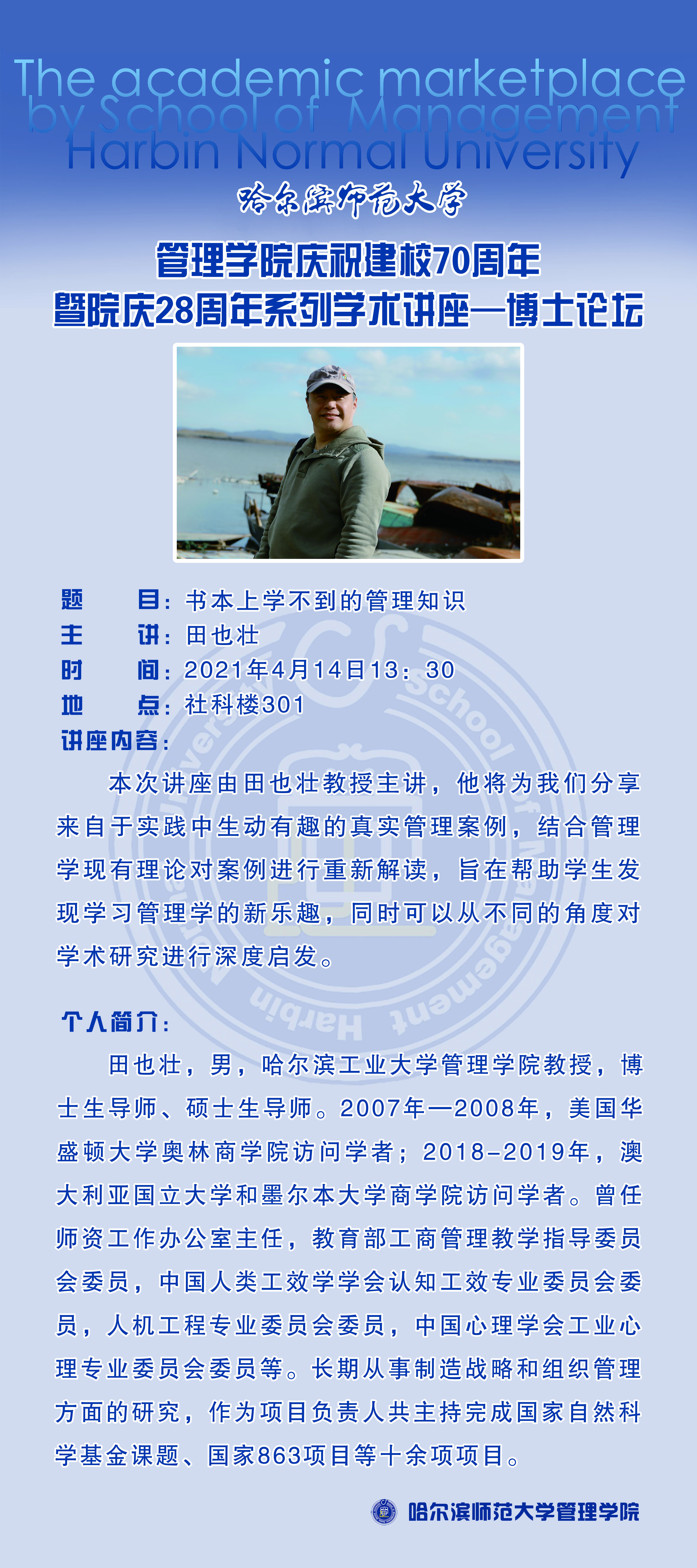 2021年恰逢中国共产党成立100周年,小说狂人 70周年校庆同时也是管理学院28周年院庆。应管理学院邀请,田也壮教授将于2021年4月14日在小说狂人 进行有关真实管理案例的相关分享讲座报告,欢迎我校师生踊跃参加。具体信息如下: