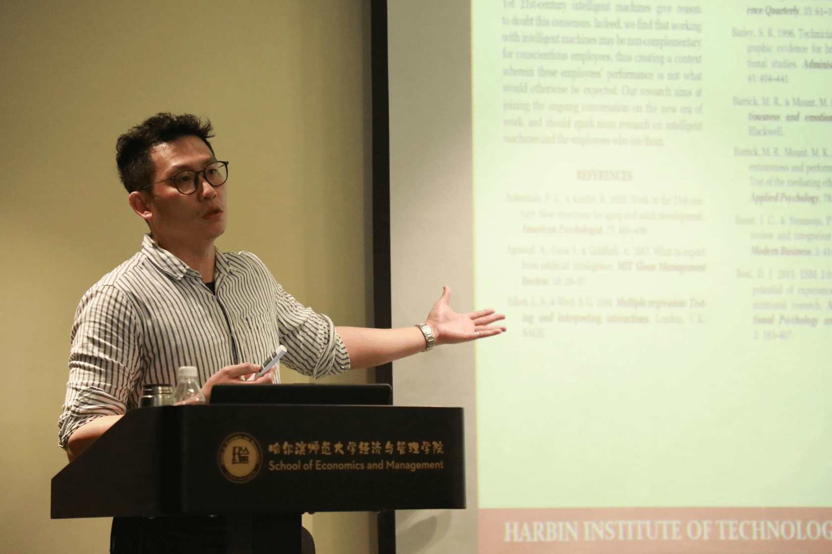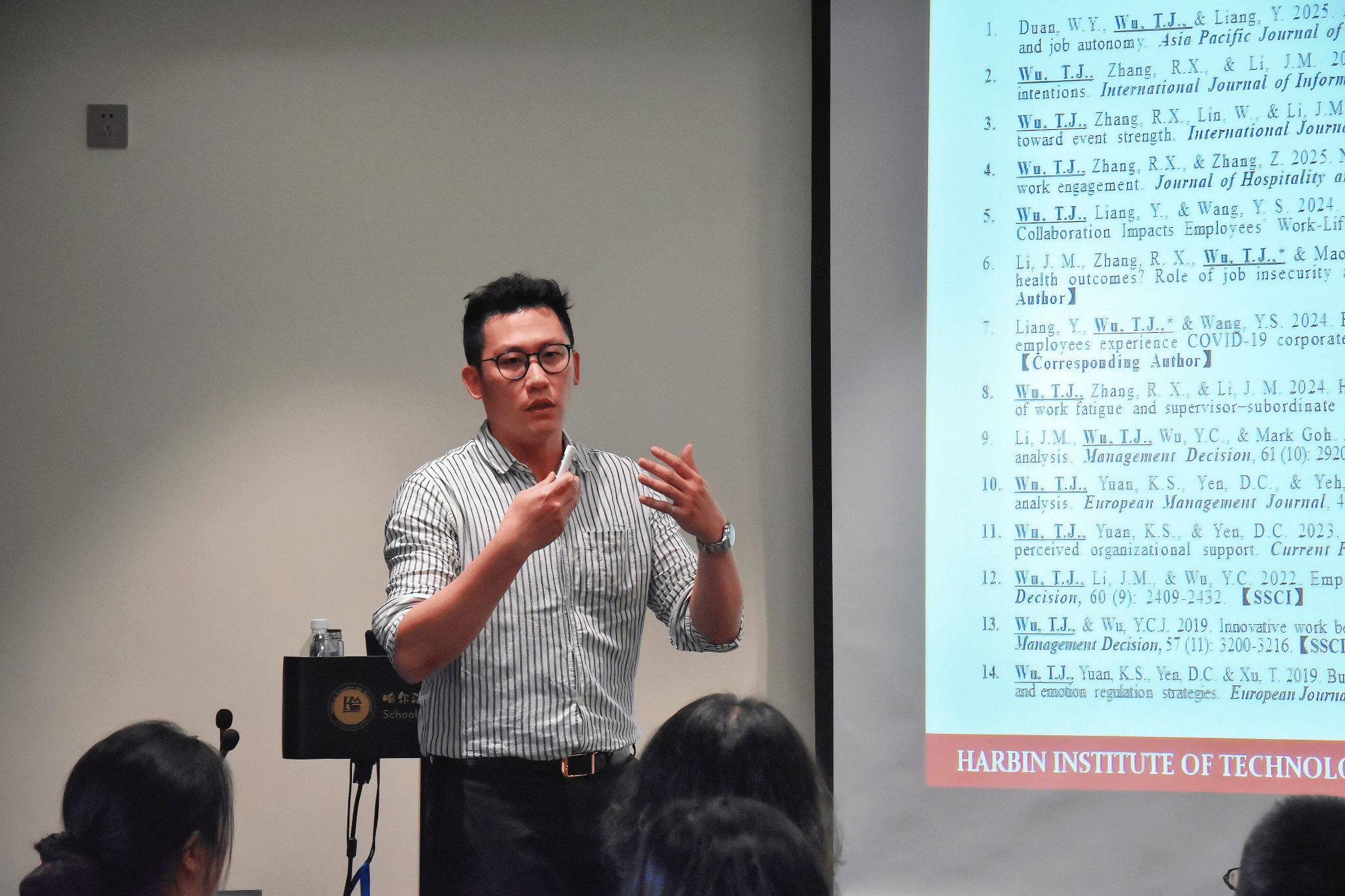 在谈及国际期刊前沿选题时,吴副教授指出,应在关注经典管理议题的同时,着眼于现实社会问题的学理提炼,提升研究的现实关怀与学术穿透力。他还深入讲解了如何科学选取理论支撑、实现理论与研究问题的精准耦合,以及如何把握论文逻辑结构、研究方法与理论阐述之间的内在一致性。此外,他还就研究范式参考、参考文献遴选、AI辅助工具的规范使用等内容进行了分享。