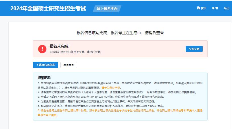 (2)请考生务必于网上报名期间在网上缴纳报考费,最迟须在10月25日22:00前完成网上缴费,后续的网上确认期间一律不再接受补缴费。未缴费的报名信息无效,不能参加考试。