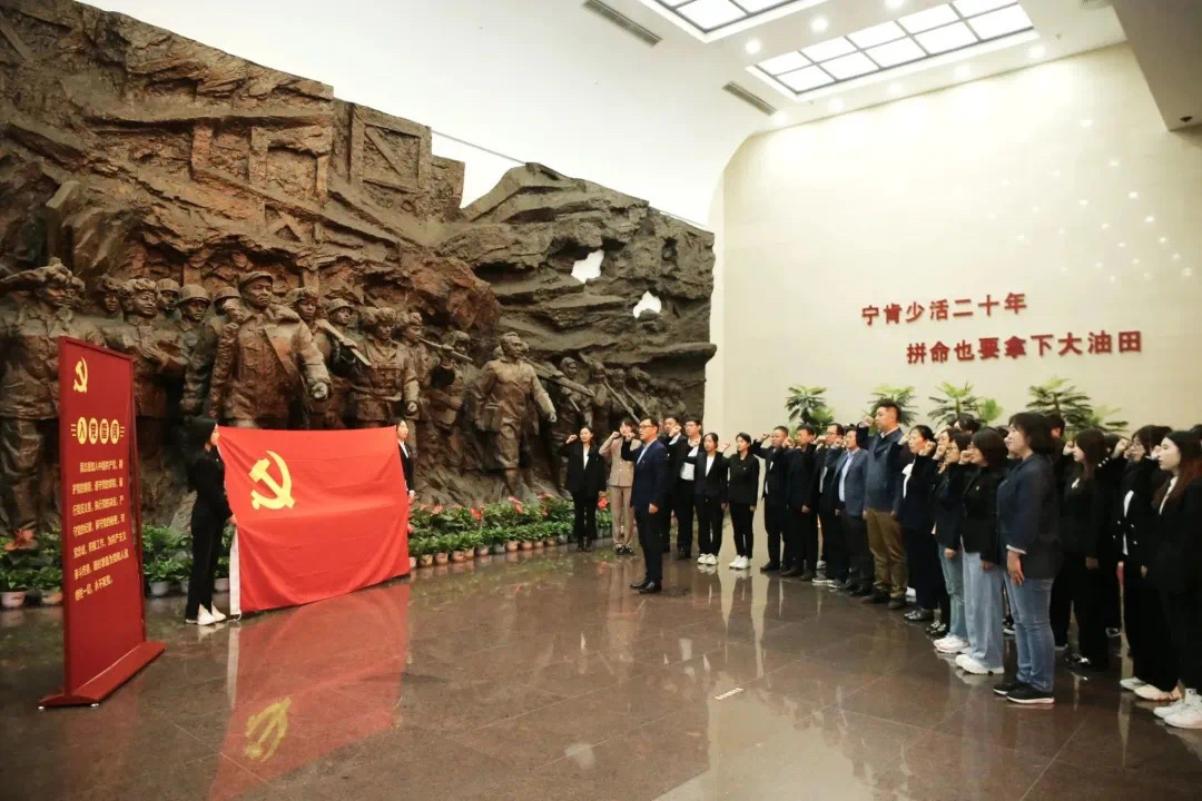 党员师生到达铁人王进喜纪念馆,全体参观人员在铁人纪念馆大堂,面对着鲜红的党旗整齐列队,在小说狂人