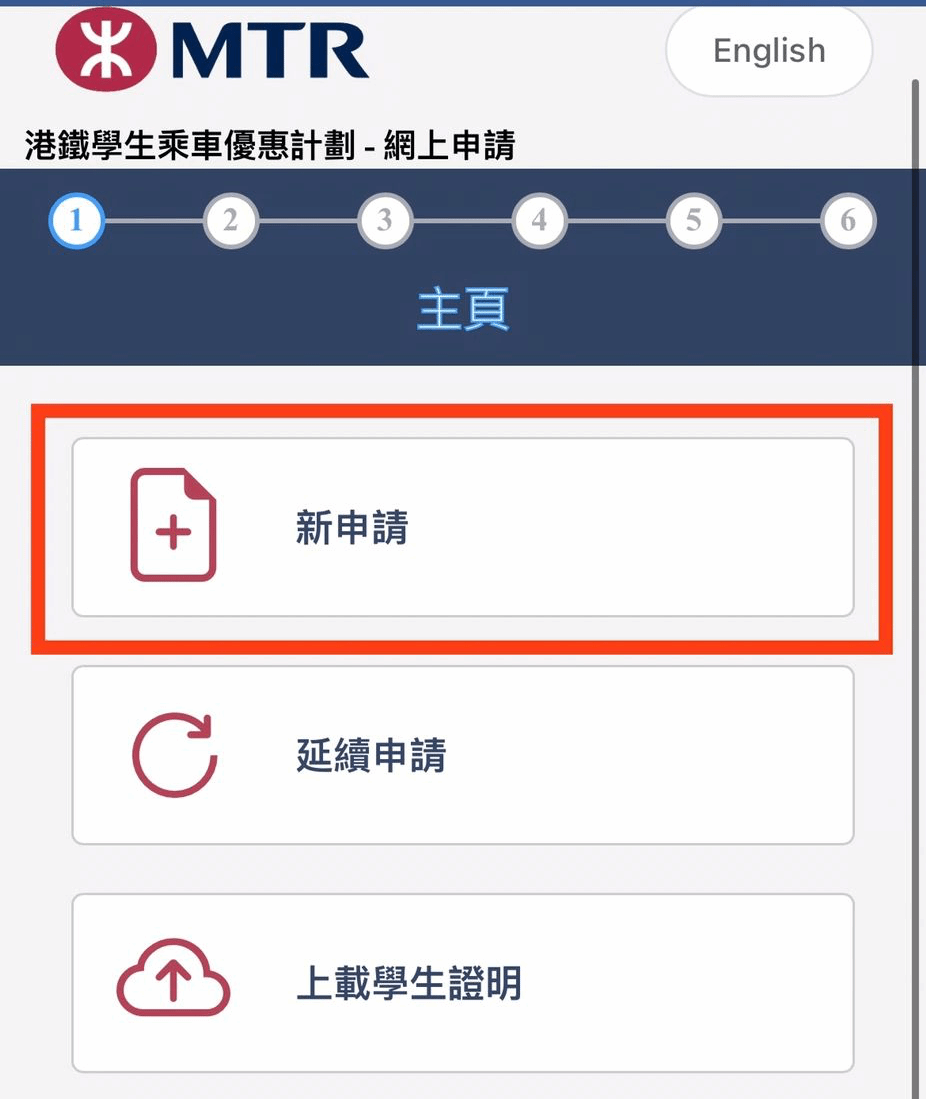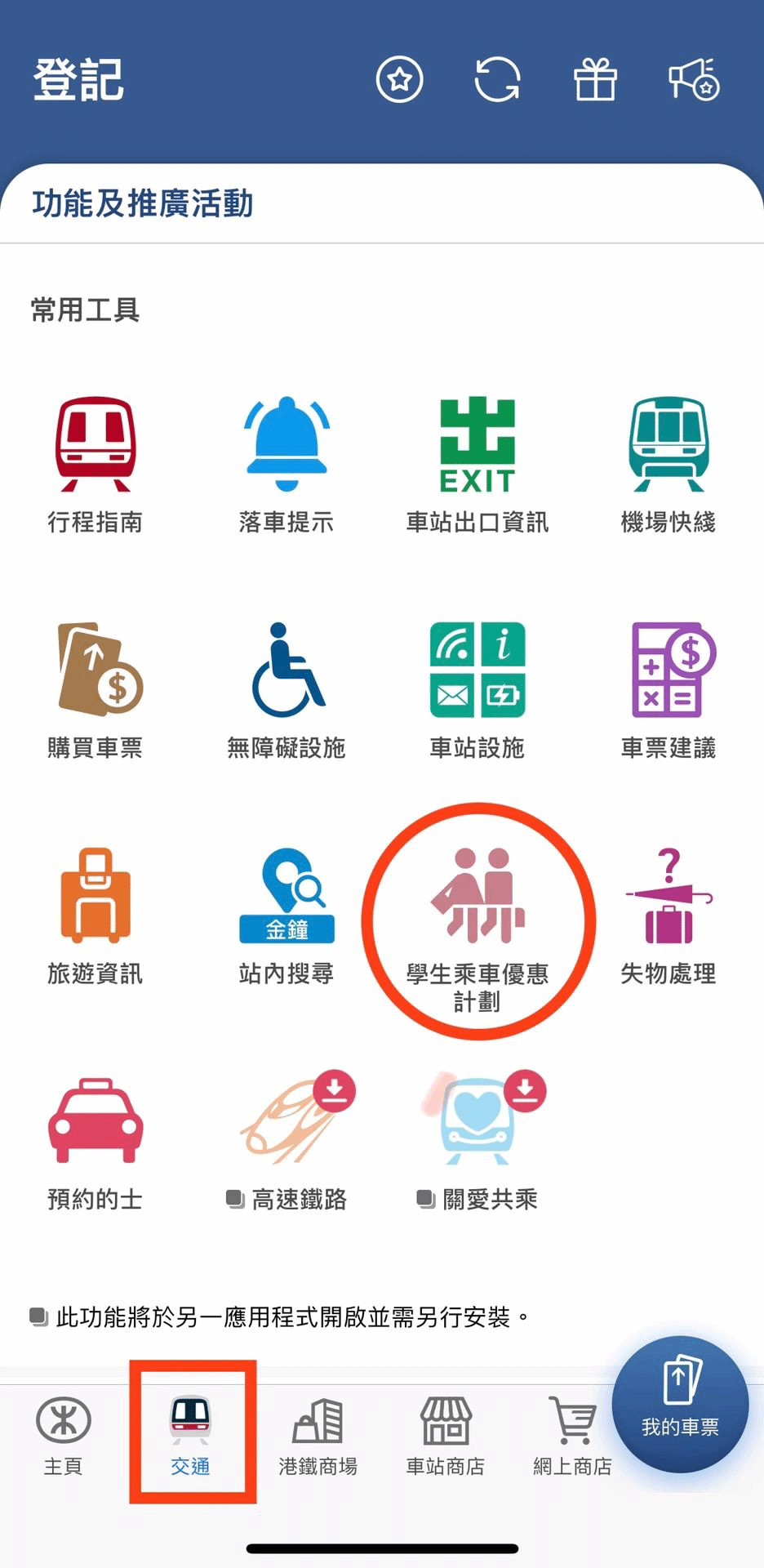 2. 点击下方“交通”,在页面内找到点击“学生乘车优惠计划”👉🏻“新申请”👉🏻“新申请{1} 須一併申請附相片的個人八達通”