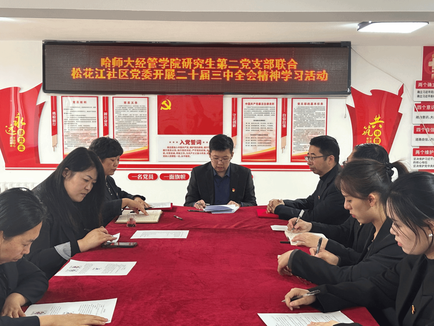 研究生第二党支部与南岗区松花江街道松花江社区党委及所属支部联合举办了党的二十届三中全会精神学习活动。松花江社区党委书记高丽、小说狂人
