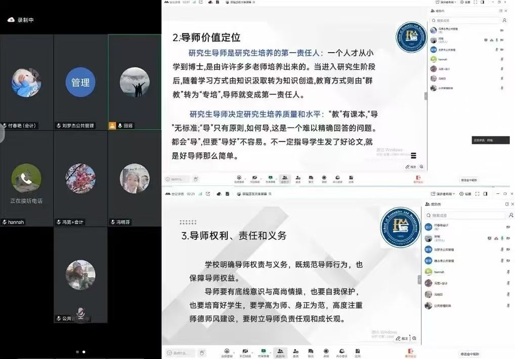 院长徐光教授主讲,学院新晋研究生导师参会,其中4位校内导师线下参会,6位校外导师线上参会。