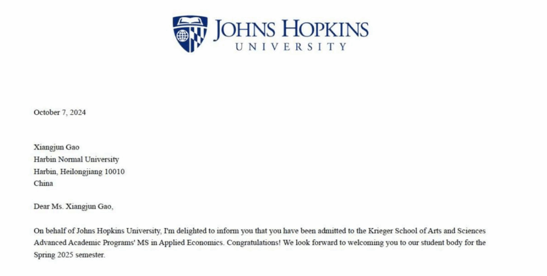 再次祝贺高湘钧同学荣获约翰霍普金斯大学录取!愿她在新的学习环境中再创辉煌!