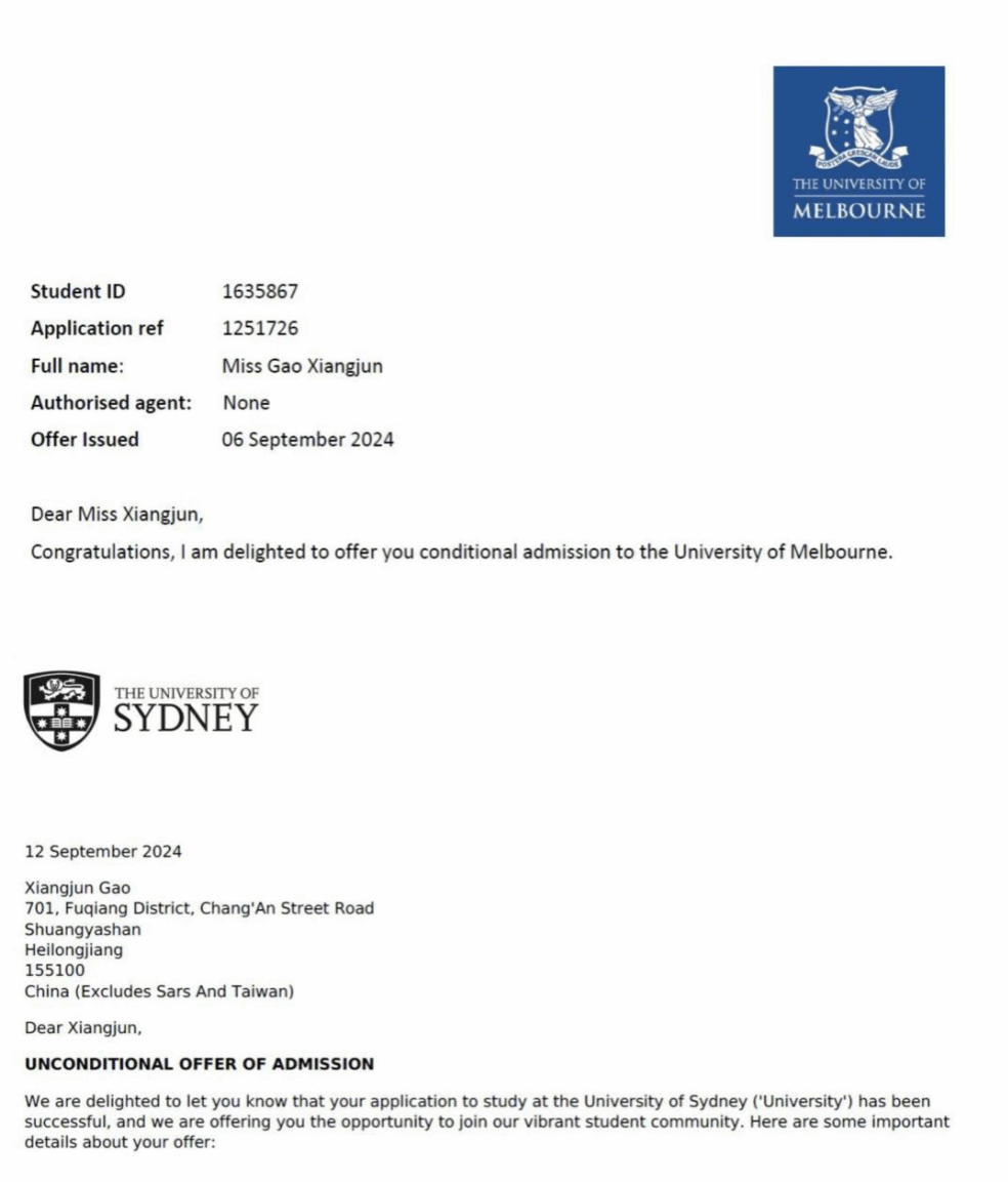 高湘钧同学获得了多个世界知名高校的录取通知,包括约翰霍普金斯大学 、墨尔本大学、悉尼大学等offer。这不仅是她个人荣誉的体现,更是我们学校教育质量和人才培养成果的彰显。
